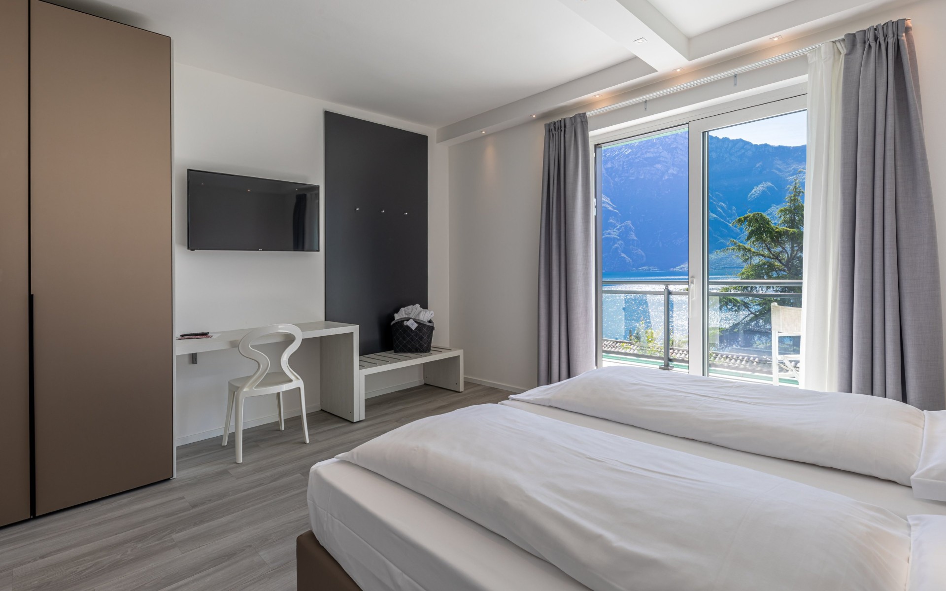 Zimmer mit modernem Design und raffiniertem Stil, ausgestattet mit überdachtem Balkon und einem bezaubernden Blick auf den Gardasee.