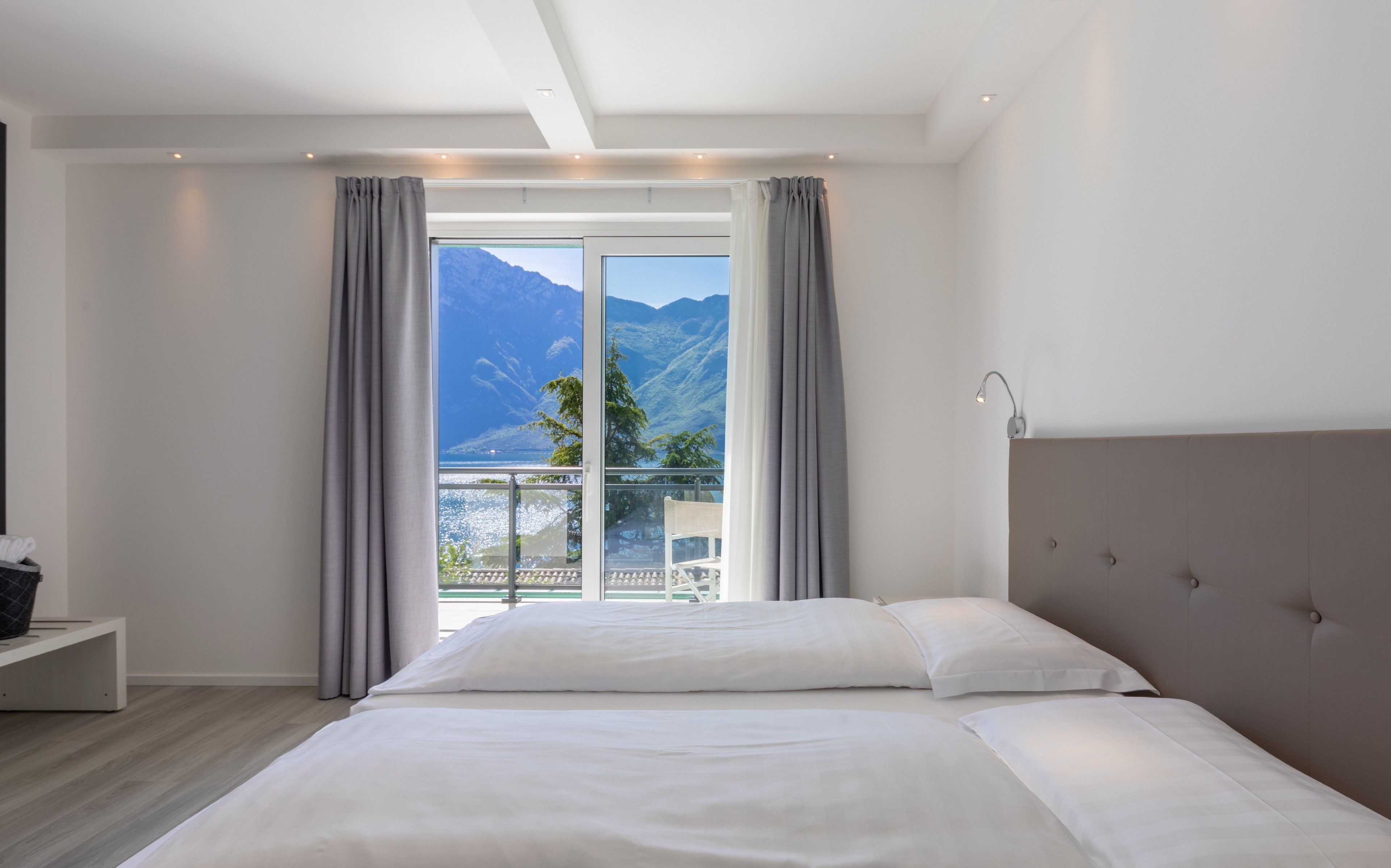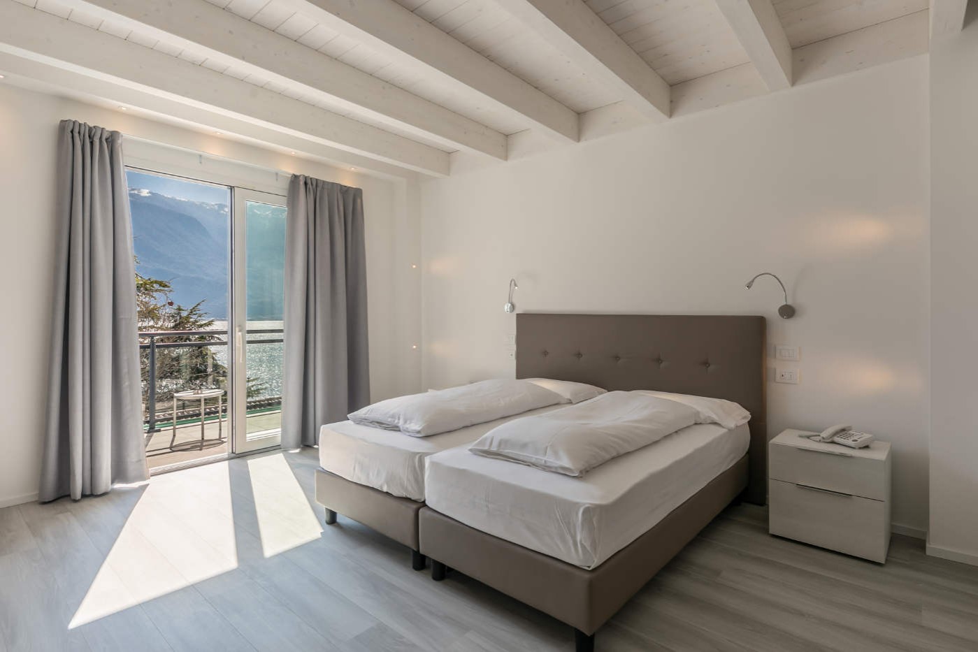 Lichtdurchflutete, komfortable Zimmer mit privatem Balkon, von dem aus Sie die ruhigen und inspirierenden Ausblicke auf den Gardasee genießen können.